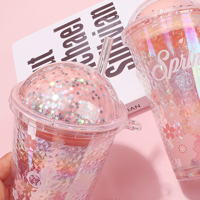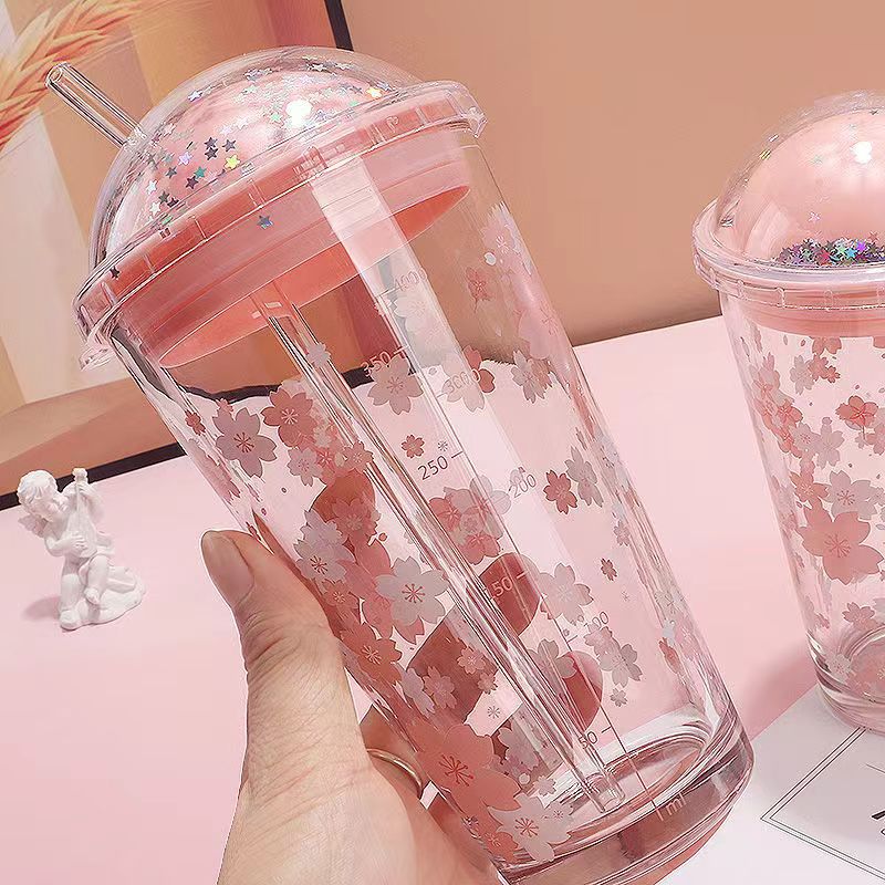 Romantic Sakura Glass Starry Sky Straw Cup with Lid
