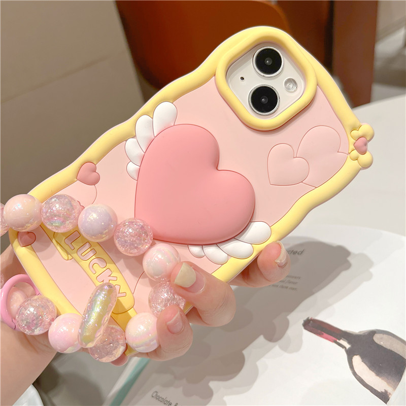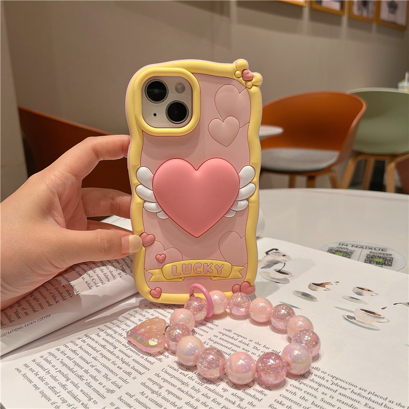 Cartoon cute iphone14pro mobile phone case pink love wings three-dimensional silicone creative personality bracelet phonecase