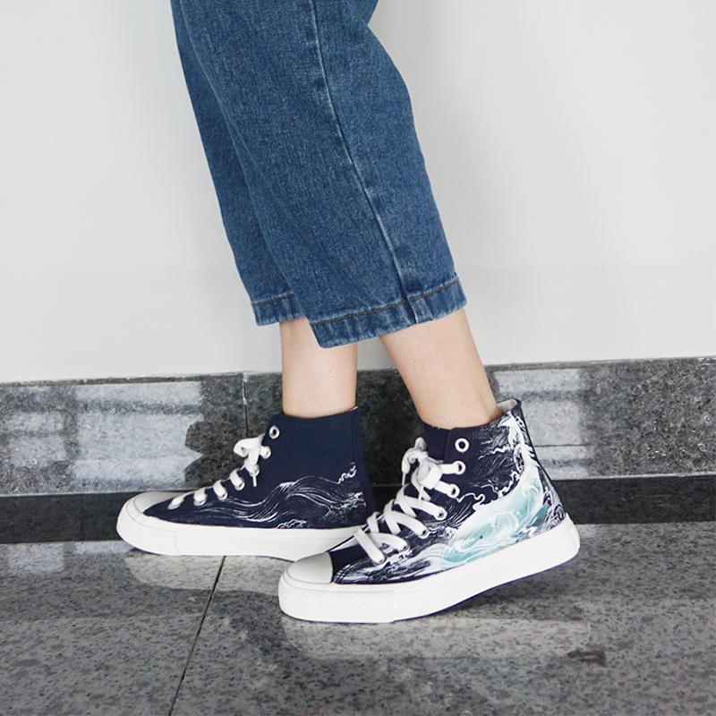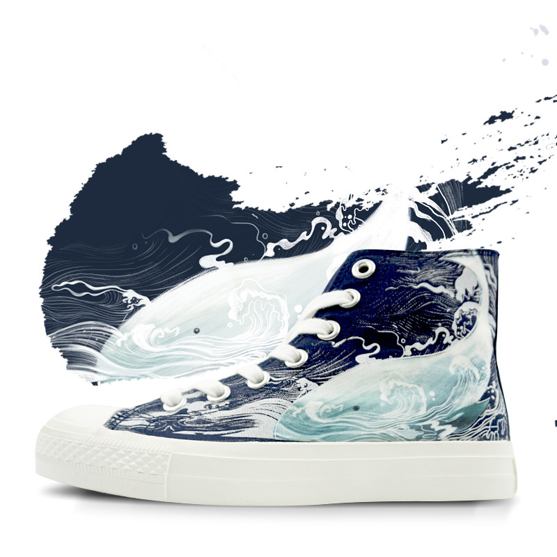 New graffiti wave whale hand-painted high-top canvas shoes