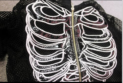Harajuku embroidery skull bones patent leather openwork mesh hooded jacket