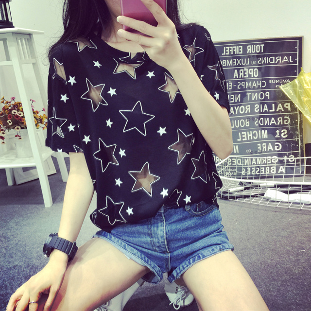 Harajuku hollow five-pointed star satellite network yarn stitching loose short-sleeved T-shirt