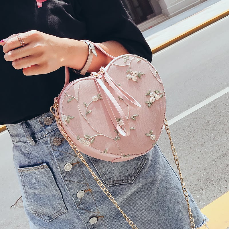 Pink Aesthetic Lace Flower Embroidered Heart-shaped Handbag with zipper closure and chain bag