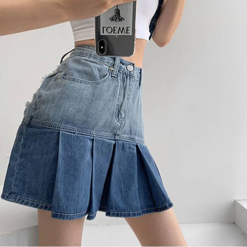 Summer American Retro Love Heart Girl High Waist Denim Pleated Skirt