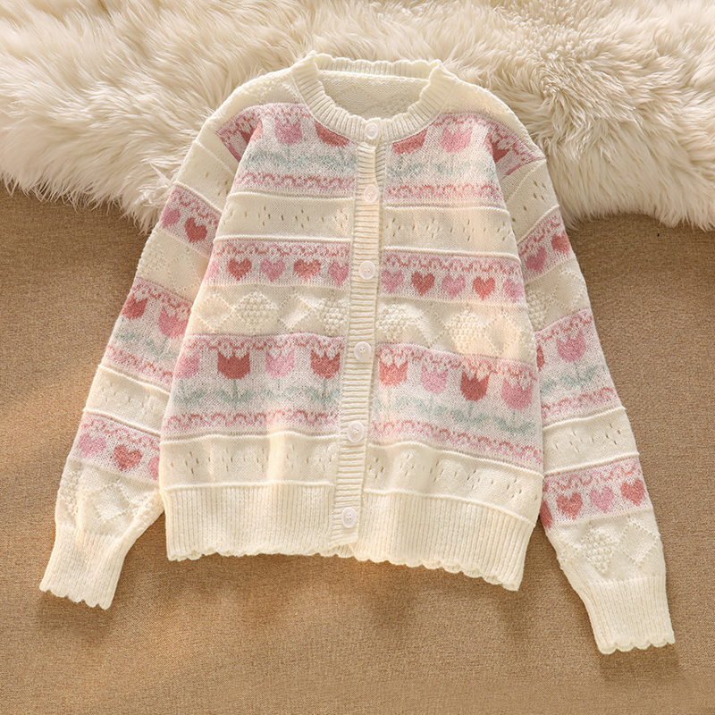 Gentle Pink Heart Jacquard Hollow Knit Cardigan Sweater