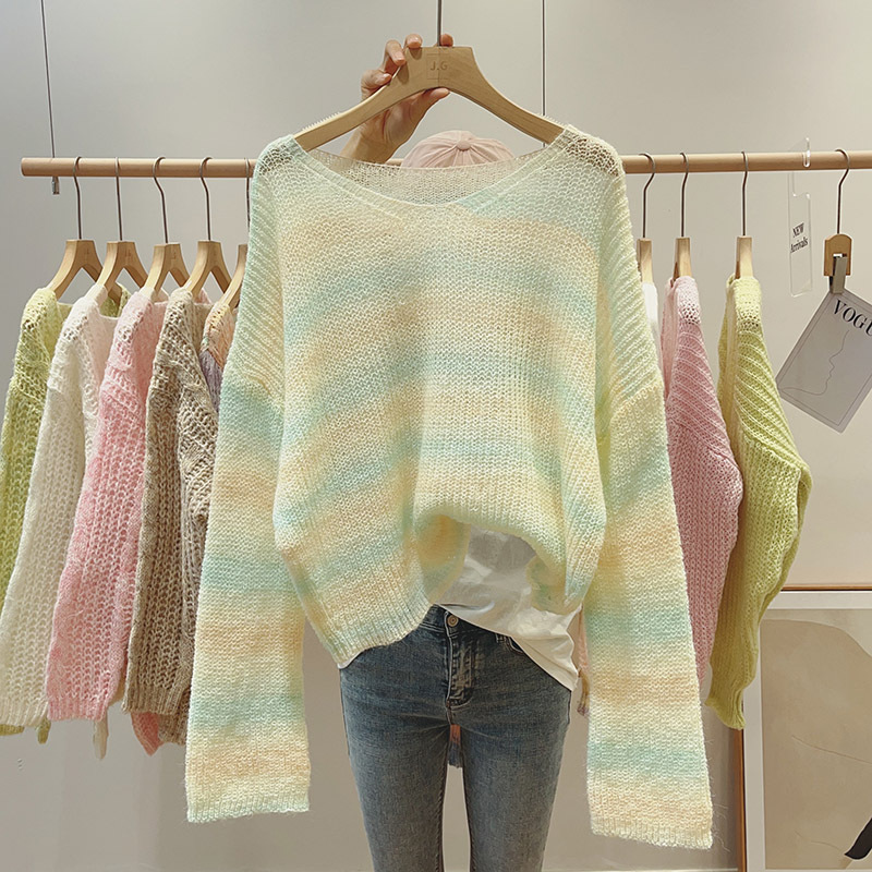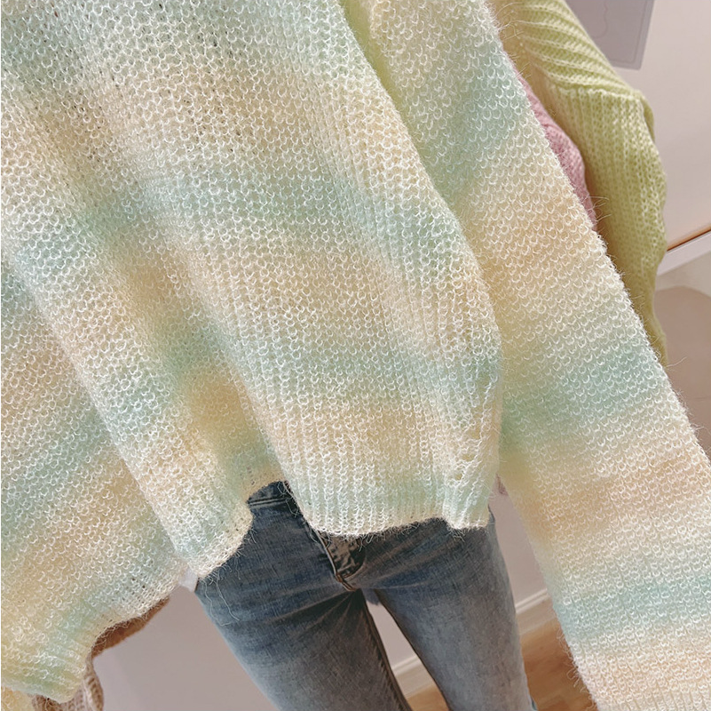 New Gradient Color Loose Sweater V Neck Mohair Color Striped Lazy Wind Thin Knit Sweater
