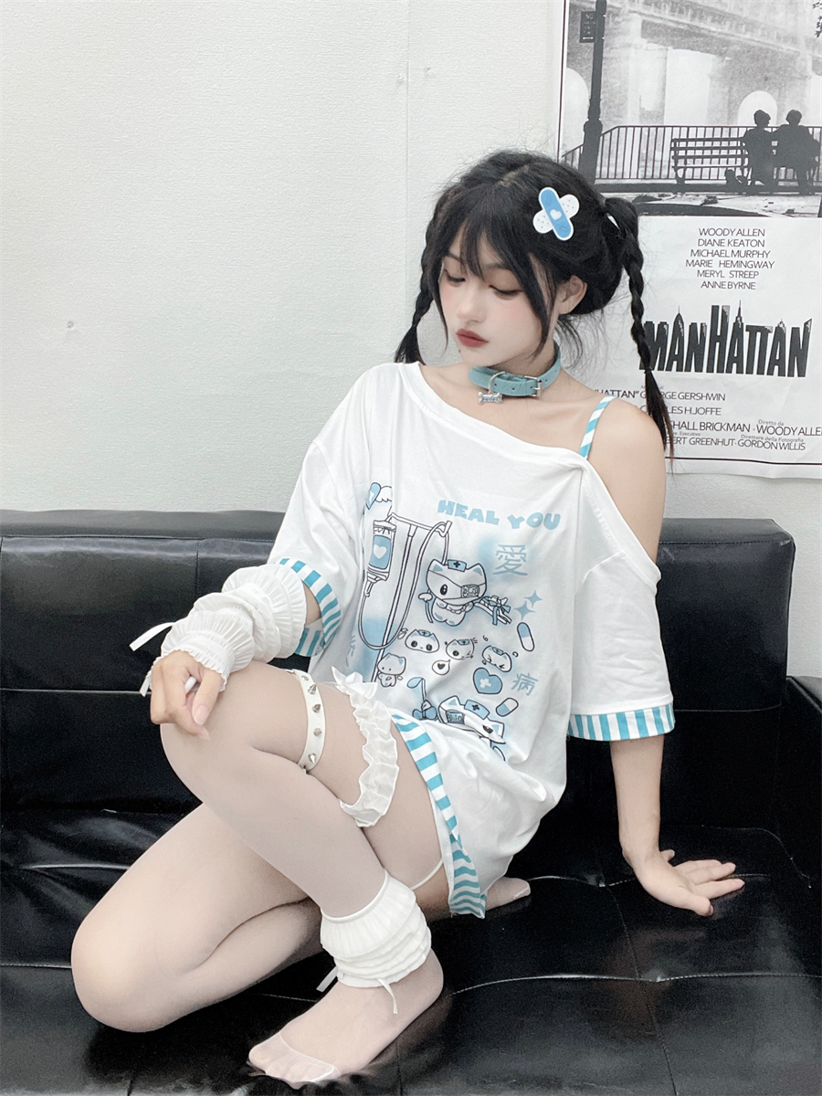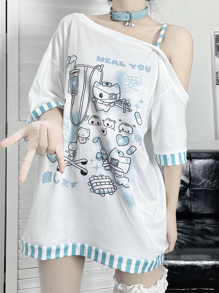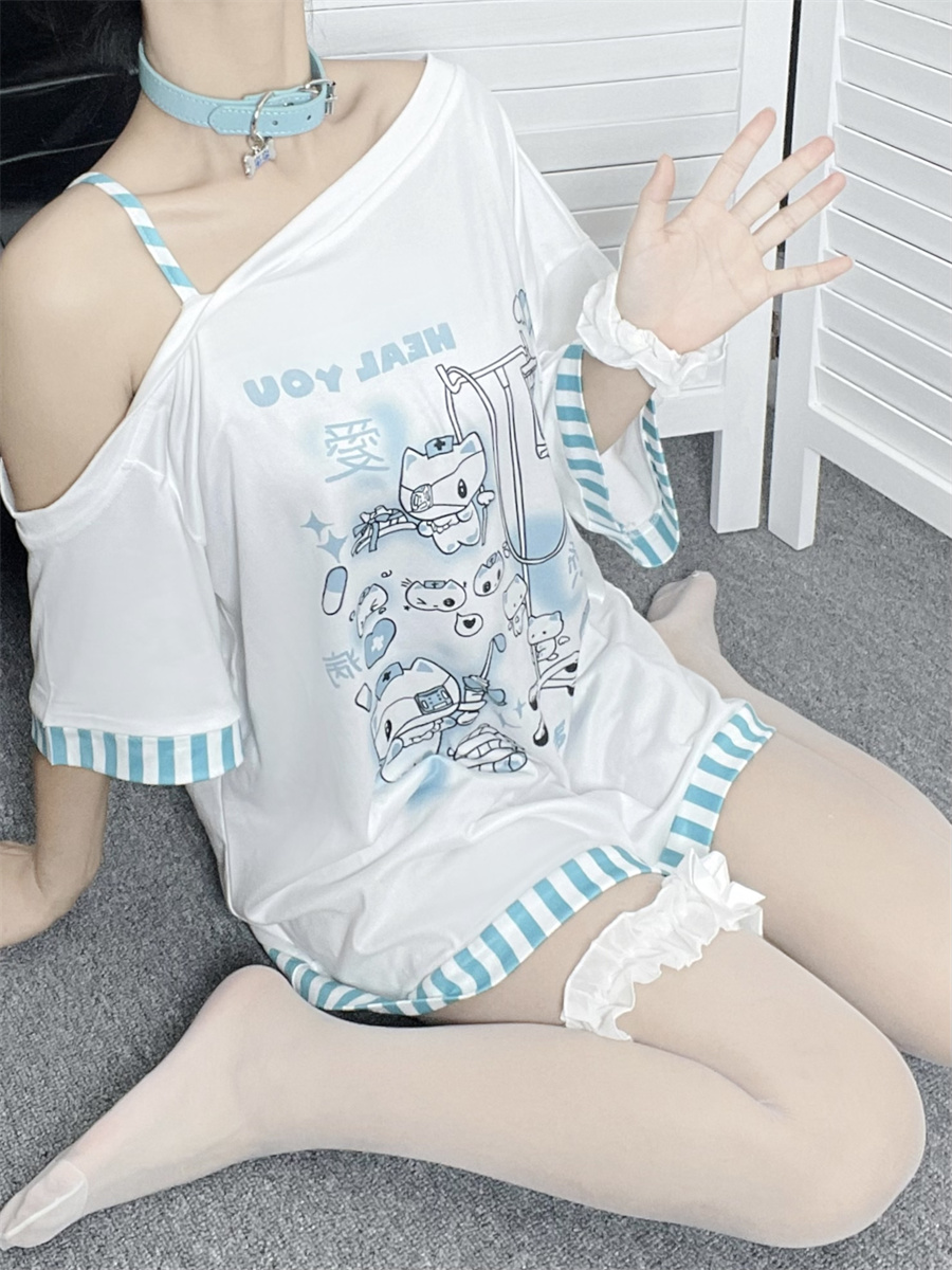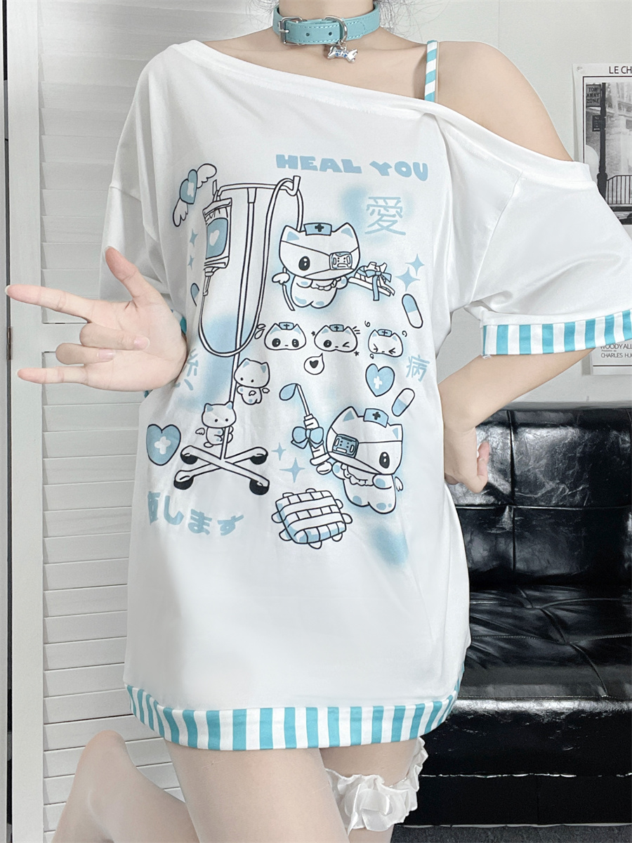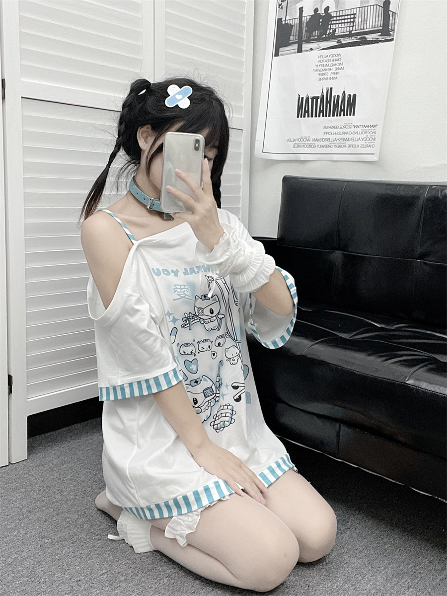Striped oblique collar off-shoulder landmine water system short-sleeved sexy top T-shirt