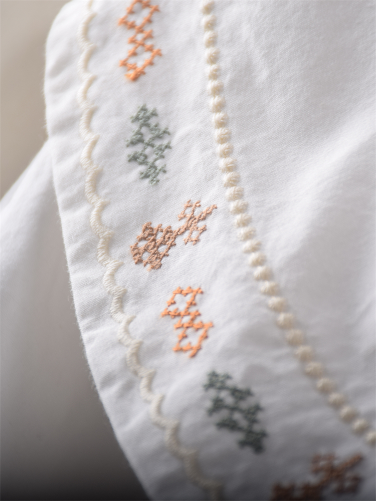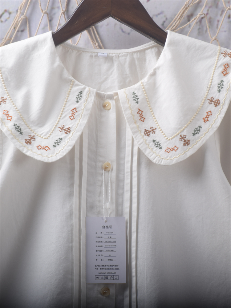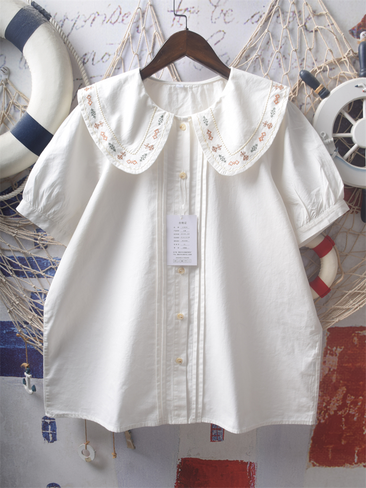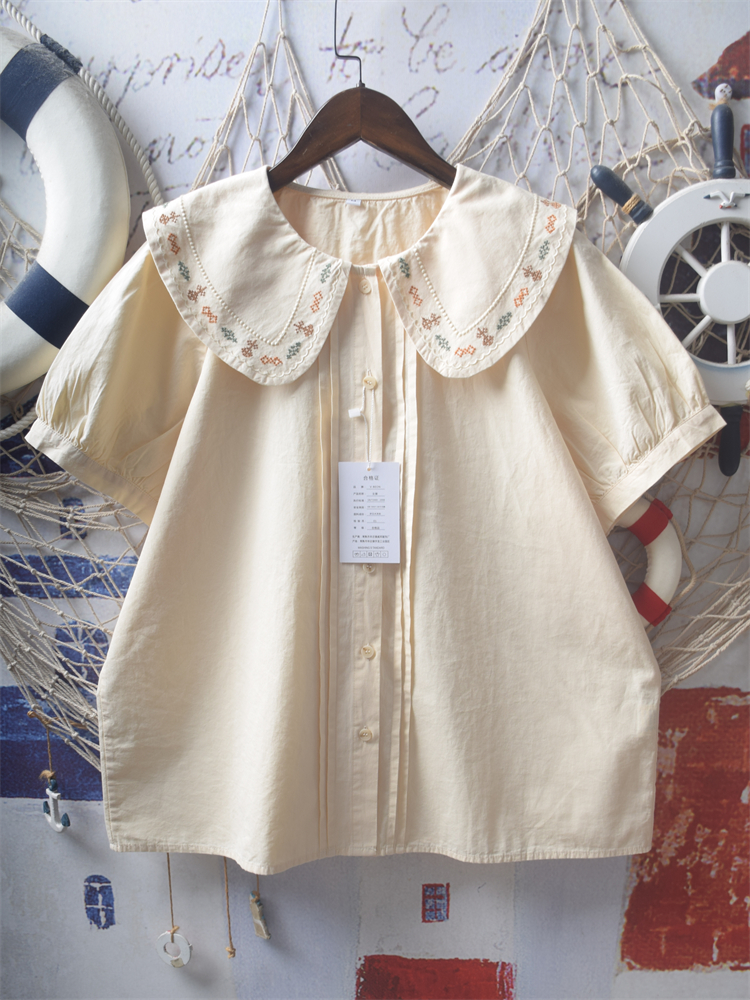 Retro style accordion pleat heavy embroidery doll collar loose short-sleeved blouses